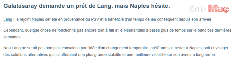 Haberde ayrıca Noa Lang’ın Napoli’de kalmak istediği, transferi durumunda ise “daha fazla istikrar ve netlik” sunacak alternatifleri değerlendirmeyi tercih ettiği ifade edildi.