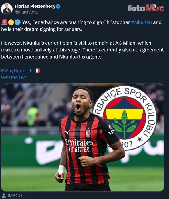 Sky Sport DE muhabiri Florian Plettenberg, Nkunku’nun Milan’da kalmak istediğini ve bu aşamada transfer ihtimalinin düşük olduğunu açıkladı.