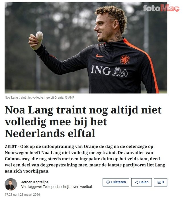 De Telegraaf’ta yer alan habere göre; Noa Lang, Norveç maçı sonrası yapılan antrenmanın bir bölümünde bireysel, bir bölümünde ise takımla birlikte çalıştı.