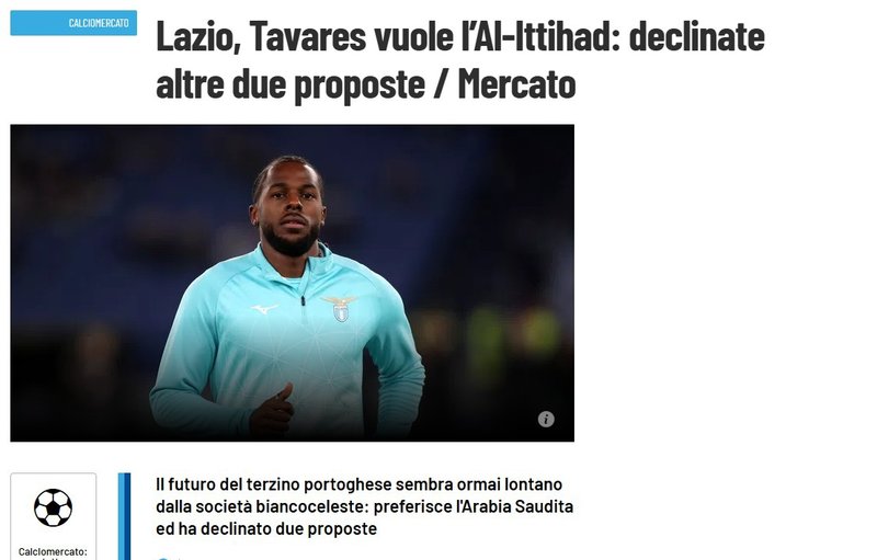 Cittaceleste.it’de yer alan habere göre; Nuno Tavares, Beşiktaş ve Zenit’in tekliflerini reddetti. Haberde Portekizli futbolcunun vatandaşı Sergio Conceicao’nun çalıştırdığı Al Ittihad ile anlaşma sağladığı ve oyuncunun kulüplerin anlaşmasını beklediği yazıldı.