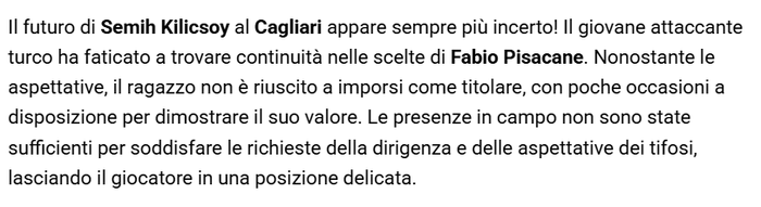 Cagliarinews24’te yer alan habere göre; Semih Kılıçsoy’un istikrarlı olmakta zorlandığı aktarıldı. Genç futbolcunun beklentilerin aksine ilk 11’de forma giyemediği ve kendini kanıtlaması için çok az fırsat bulduğu yazıldı.