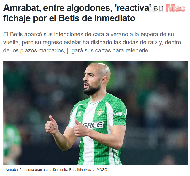 Bu sezon yaşadığı sakatlıklar nedeniyle uzun süre formasından uzak kalan Amrabat hakkında Real Betis’in Fenerbahçe’den bonservisini alıp almamak konusunda kararsızlık yaşadığı ancak Faslı futbolcunun sakatlık dönüşünde Panathinaikos karşısında gösterdiği performans sonucunda İspanyol ekibinin tüm şüphelerini ortadan kaldırdığı öğrenildi.