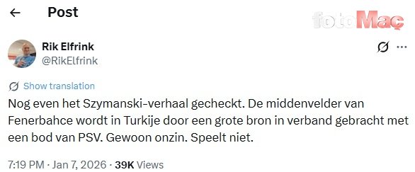X hesabından yaptığı paylaşımla ilginin doğru olmadığını ifade eden Elfrink, “Szymanski hikayesini az önce kontrol ettim. Fenerbahçeli orta saha oyuncusu, PSV’nin teklifiyle ilişkilendiriliyor. Bu tamamen saçmalık. Böyle bir durum söz konusu değil.” açıklamasını yaptı.