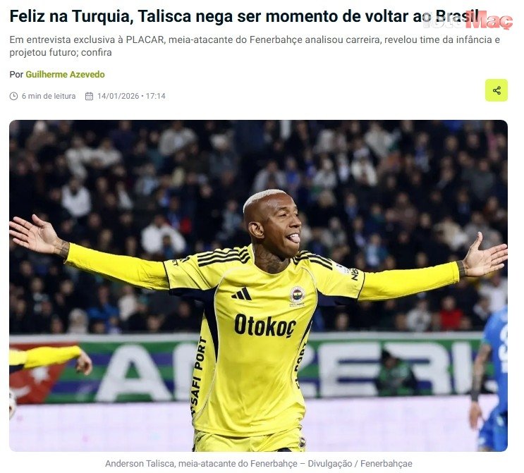 PLACAR’a konuşan Talisca, Brezilya’ya dönme olasılığıyla ilgili, “Şu an doğru zaman değil. Burada hâlâ verebileceğim çok şey var. Bir gün, kim bilir, belki Brezilya’ya dönerim. Ama burada kalmak için birkaç yılım daha var, Türkiye’de çok mutluyum.” ifadelerini kullandı.