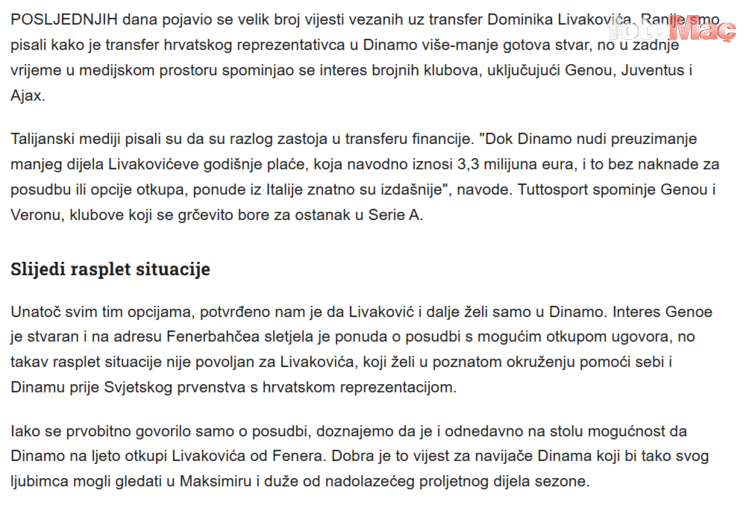 Hırvat basınından Index HR’nin aktardığına göre Dinamo Zagreb, Livakovic’i kadrosuna katmak için Fenerbahçe’ye resmi teklifte bulundu. Ancak sarı-lacivertli yönetim, gelen öneriyi kabul etmedi.
