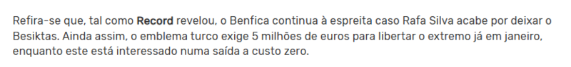 Portekiz basınından Record’un haberine göre siyah-beyazlı yönetim, Rafa Silva’nın serbest kalmasına onay vermek için 5 milyon euro bonservis bedeli talep ediyor. Ancak oyuncunun tarafı bu bedeli ödemeye yanaşmıyor.