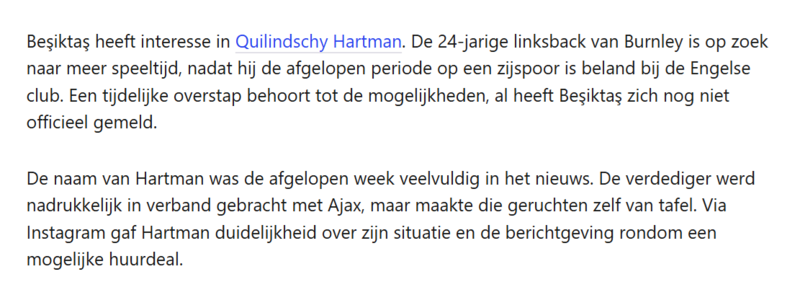 OneFootball’da yer alan habere göre, Beşiktaş’ın listesinde öne çıkan isim Premier Lig ekiplerinden Burnley’de forma giyen Hollandalı sol bek Quilindschy Hartman oldu. Siyah-beyazlılar, 24 yaşındaki oyuncuyu sezon sonuna kadar kiralık olarak kadroya katmayı planlıyor.