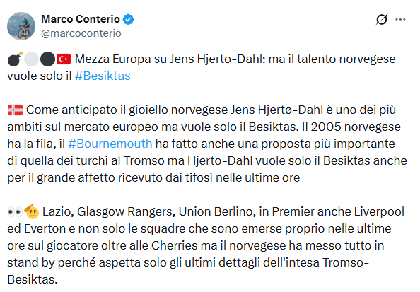 Öte yandan genç oyuncunun transferine dair flaş bir gelişme yaşandı. Gazeteci Marco Conterio’nun haberine göre; Jens Hjerto-Dahl’ın birçok önemli kulübü reddederek Beşiktaş’a gitmek istediği öğrenildi.