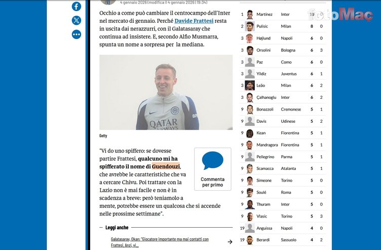 “Size bir tüyo vereyim: Eğer Frattesi ayrılırsa bana birisinin söylediğine göre, Inter’in hocası Chivu’nun istediği oyuncu özelliklerine sahip Guendouzi ile temasa geçilecek. Lazio ile transfer konusunda anlaşmak hiç kolay değil ve devam eden sözleşmesi var. Ama önümüzdeki haftalarda transferin gerçekleşme ihtimali bulunuyor.”