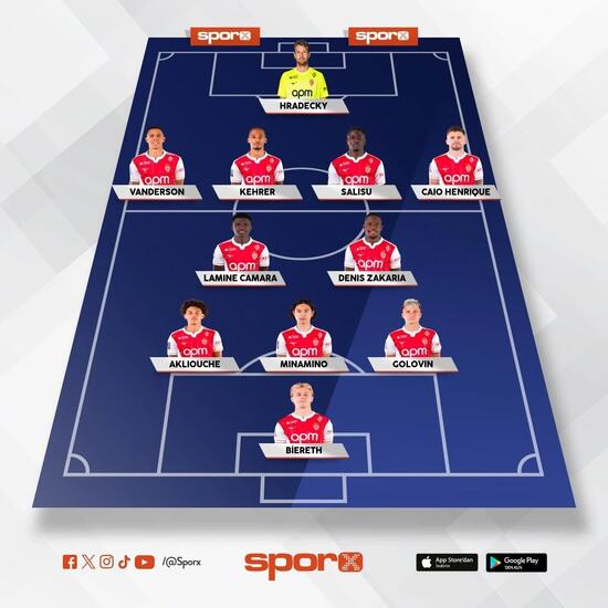Monaco: Hradecky, Vanderson, Kehrer, Salisu, Henrique, Camara, Zakaria, Akliouche, Minamino, Golovin, Biereth