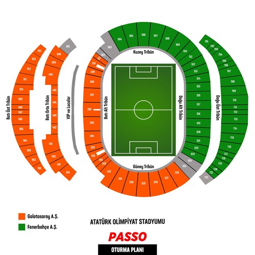 – Galatasaray taraftarlarına ayrılan bölümlerden sadece Galatasaray A.Ş. logolu Passo Taraftar kart sahiplerine bilet satışı yapılacaktır. Son 365 gün içinde Fenerbahçe A.Ş. logolu Passo Taraftar kartlarını iptal ettiren taraftarlara bu bölümden bilet satışı yapılmayacaktır. Rakip takım logolu kart haricinde diğer logolu Passo Taraftar kart sahipleri Galatasaray A.Ş. logolu kart edinmeleri halinde müsabakaya bu bölümden bilet satın alabilirler.