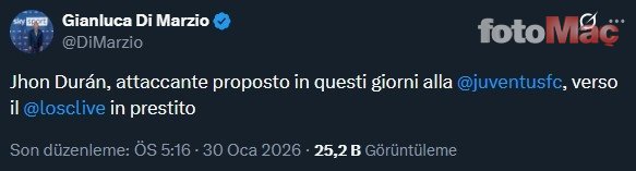 İtalyan gazeteci Gianluca Di Marzio, Jhon Duran’ın kiralık olarak Lille’e transfer olacağını açıkladı.